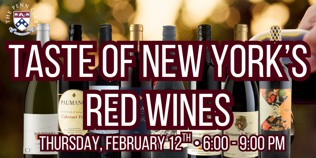 Join us for a unique exploration of New York’s signature red grape at this special Cab Franc Forward New York evening at The Penn Club. Members will begin with a welcome pour of sparkling or rosé, followed by a seated presentation introducing Cabernet Franc’s rising prominence in the state and an overview of the three major winegrowing regions represented: the Finger Lakes, Long Island, and the Hudson Valley. Following the presentation, guests are invited to enjoy a walk-around tasting with all eight founding wineries of Cab Franc Forward New York. Each winery will be represented by a winemaker or owner, offering members an exceptional opportunity to meet the people behind the wines and experience the depth and diversity of New York Cabernet Franc firsthand.