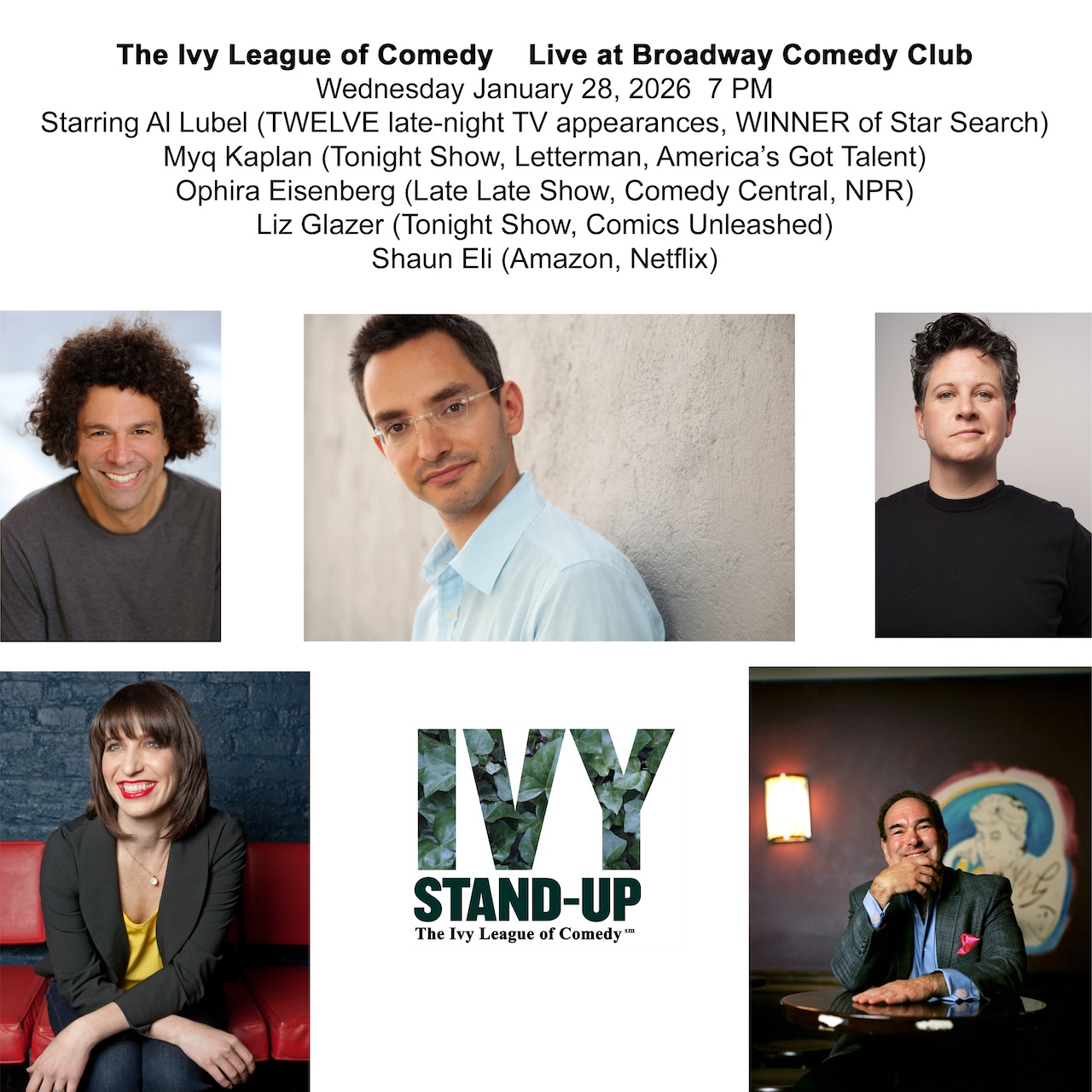 Join us for a hilarious night of comedy hosted by The Ivy League of Comedy. The night will include a premier group of stand-up comedians - starring Al Lubel, Myq Kaplan, Ophira Eisenberg, Liz Glazer, Shaun Eli. -